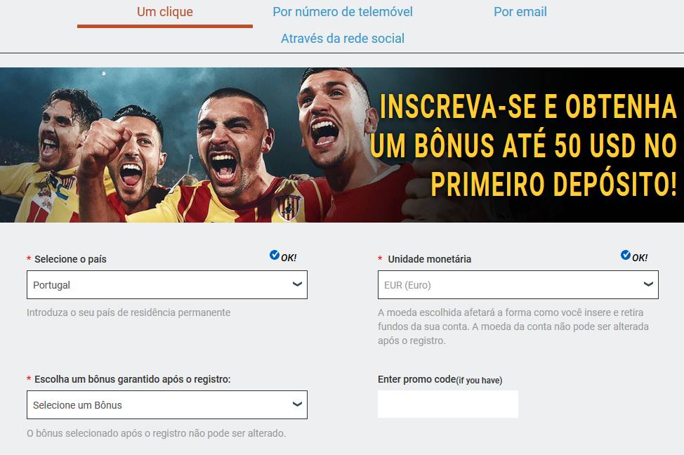A inscrição na plataforma da casa de apostas desportivas online é muito simples. Para começar clique em "Inscrição" no canto superior direito da página inicial. Na nova página que foi aberta, selecione o seu país de residência no campo "Escolha um país" e a sua divisa no campo "Moeda", Não se esqueça de inserir o seu código promocional se tiver um.